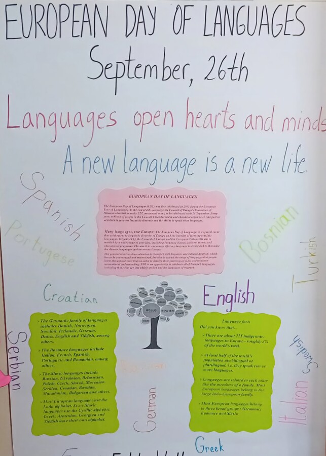 Obilježavanje Evropskog dana jezika u našoj školi proteklo je u duhu kreativnosti, zajedništva i refleksije kroz nastavu engleskog, njemačkog i bosanskog jezika. Učenici su pokazali izuzetnu sposobnost povezivanja jezika s identitetom i kulturom.
