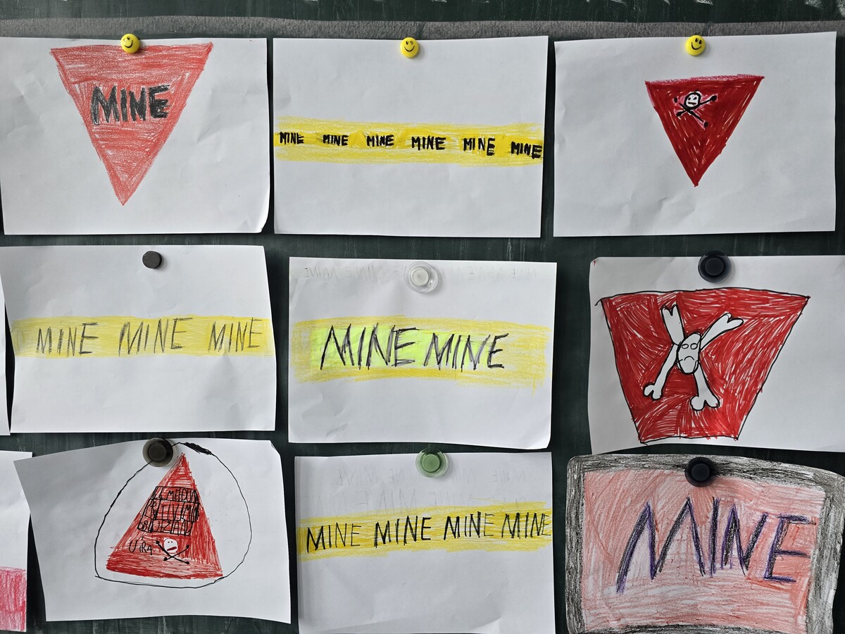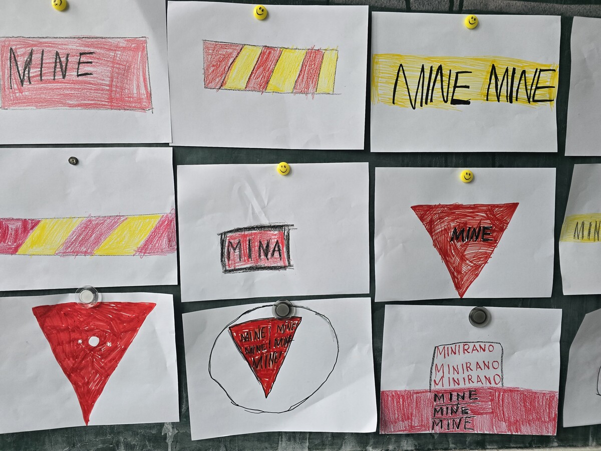 Kao najkreativniji dio radionice, učenici su dobili zadatak da kreiraju vlastitu viziju minske oznake koristeći pribor za crtanje i različite materijale. Nakon praktičnog rada, svako dijete je prezentiralo svoj crtež i drugarima iz razreda ukratko objasnilo zbog čega je oznaku dizajniralo upravo na taj način.